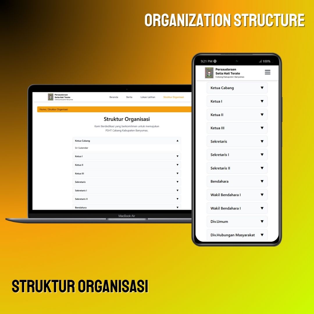 Menampilkan bagan dan informasi mengenai struktur kepengurusan organisasi PSHT, dari pusat hingga cabang.