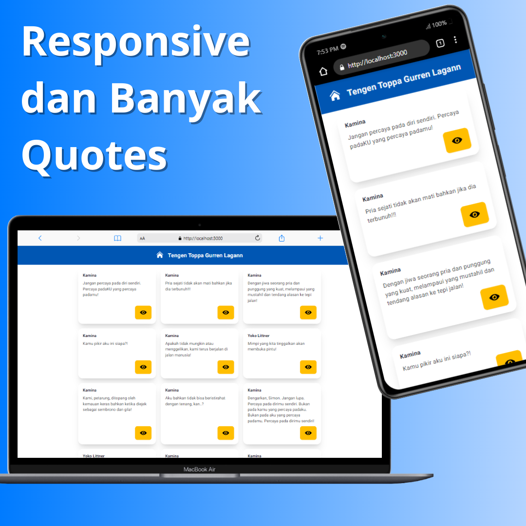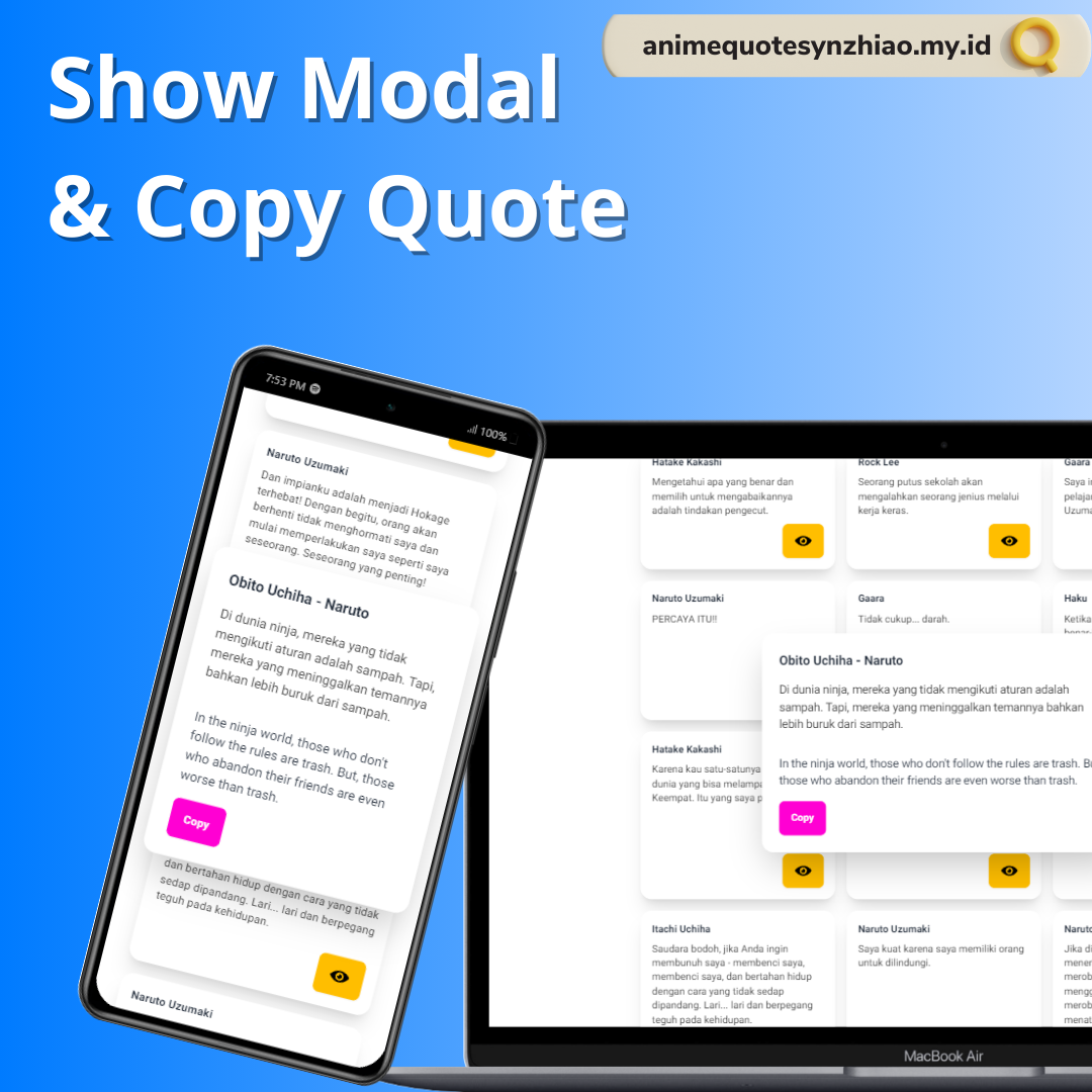 Anime Quotes merupakan projek sederhana yang menampilkan banyak quote dari karakter - karakter anime. Anime Quotes dikembangkan menggunakan React JS sebagai wadah utama dengan styling dari Daisy UI Tailwind CSS serta data quotes yang didapatkan dengan melakukan Axios Get ke free API https://katanime.vercel.app/api . Setelah data didapatkan dan diolah, diterapkanlah manipulation map array untuk menampilkan per data result ke dalam card.